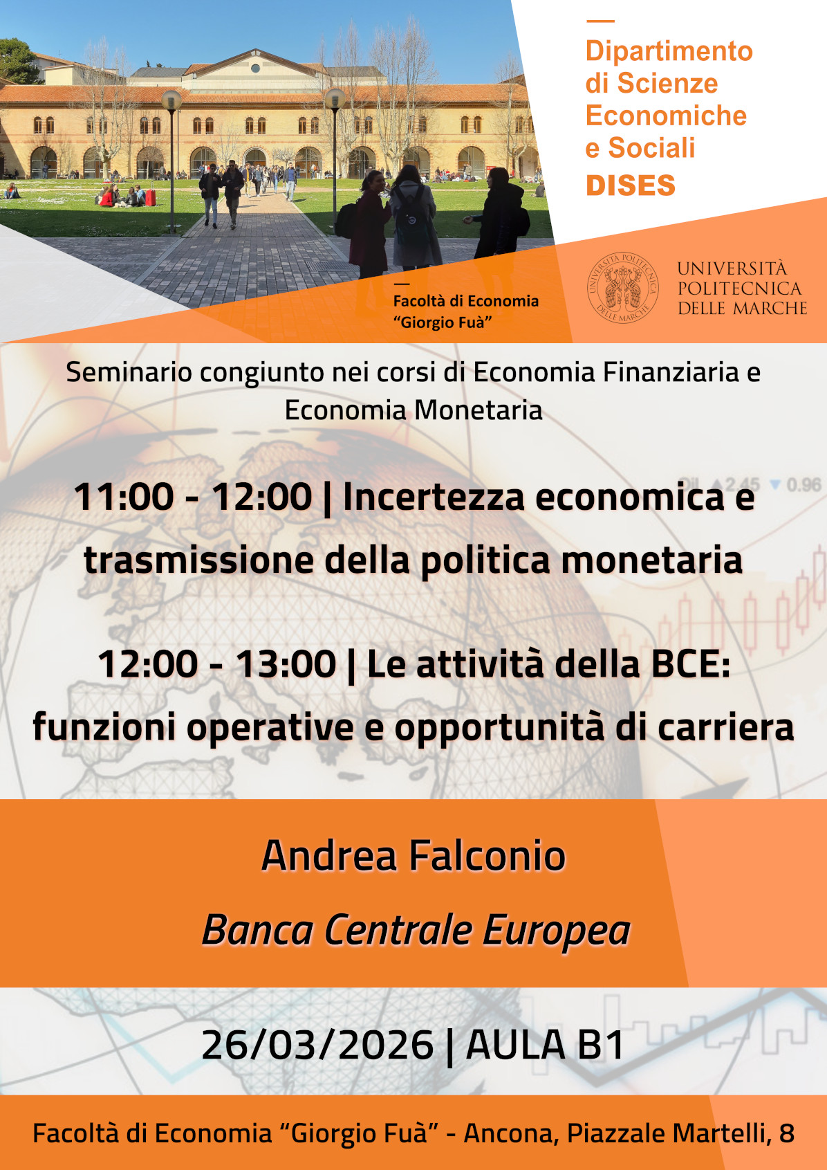 Seminario congiunto nei corsi di Economia Finanziaria e Economia Monetaria: "Incertezza economica e trasmissione della politica monetaria", "Le attività della BCE: funzioni operative e opportunità di carriera" di Andrea Falconio
