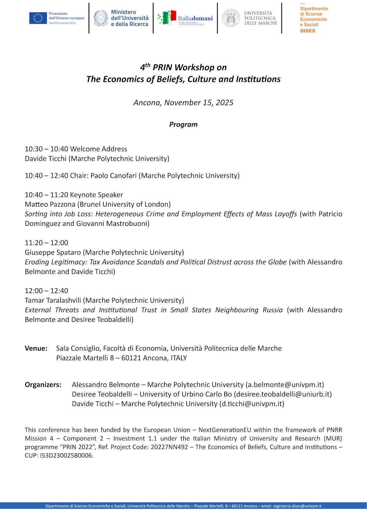 4th PRIN Workshop on The Economics of Beliefs, Culture and Institutions